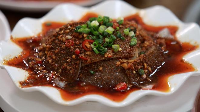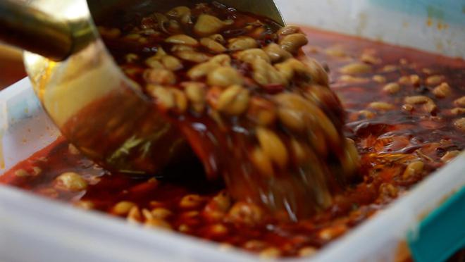 處理好的肥腸色澤透亮、Q彈鮮嫩,再加入調制好的醬料不斷攪拌,肥腸也逐漸染上醬料濃亮的紅色,原本清亮透粉的肥腸此時已被染上濃濃的醬色。這一步驟對廚師的功底極為考究,火候決定著肥腸的口感,時間太長則爛,時間太短則難以咬動。