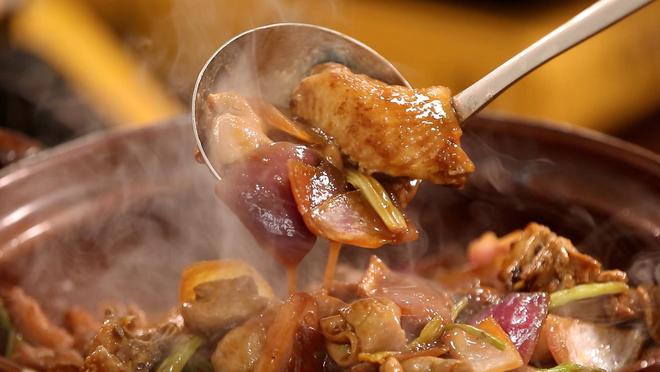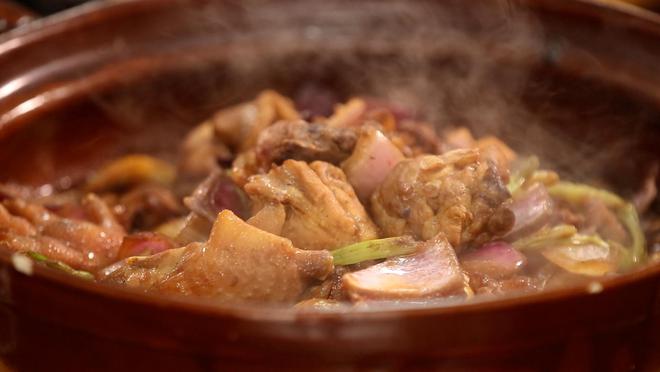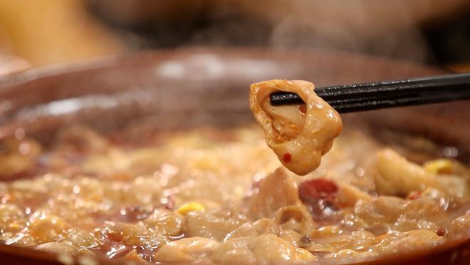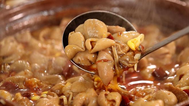 肥腸雞煲,少許蒜頭與姜片在熱油中翻炒,再加入自制底料,炒出香味。先加入肥腸,奠定這一道菜的底味,再加入新鮮雞肉。肥腸和雞肉在醬料的刺激下煥發新出的味覺體驗。再倒入煲內,煲里鋪上一層豆芽,吃起來更是爽口。