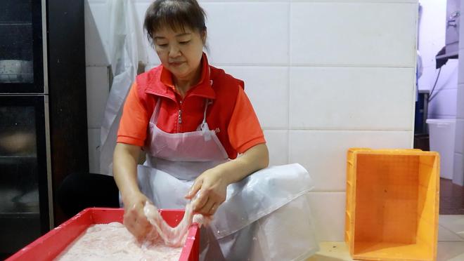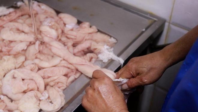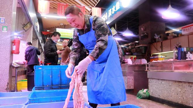 挑好的肥腸送到店后,還需要作進一步的挑選。