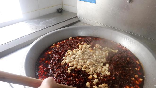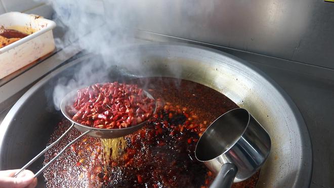 配料按照嚴格的配比放入大鍋中熬煮,依照調料的“性格”,選擇在不同時候放入,每一種調料都不會喧賓奪主,十余種調料達到了高度和諧。底料鮮、辣、咸兼具,濃烈的氣味、紅艷的色澤,予以視覺與味覺至極的沖擊。